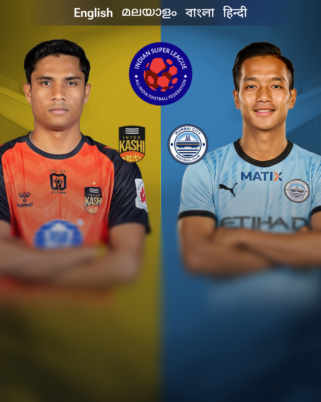 Match: ISL 2025-26. Teams: Inter Kashi FC vs Mumbai City FC. Status: Live matchLiveISL 2025-26Inter Kashi FCMumbai City FC