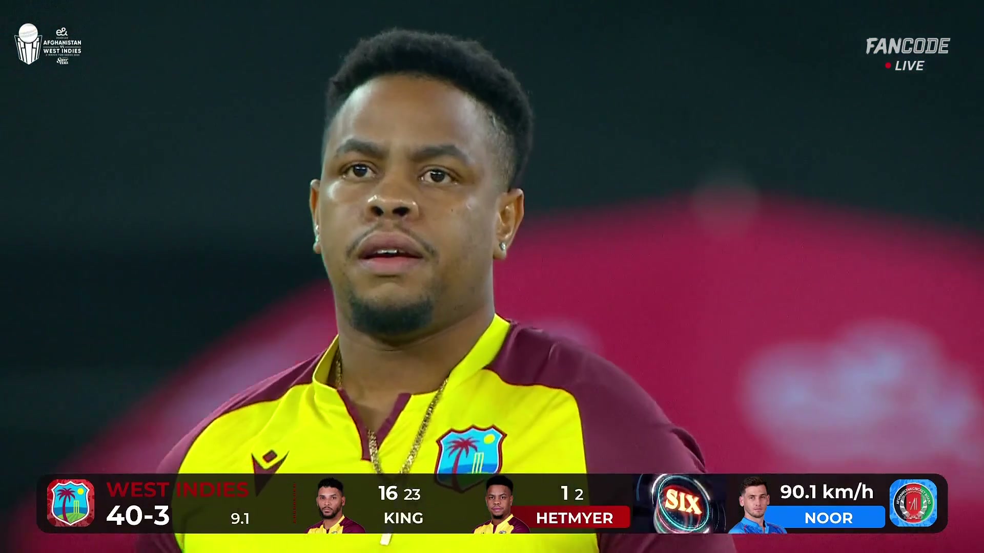 poster url for Six! Shimron Hetmyer Goes Down On One Knee And Heaves It For A Huge Maximum