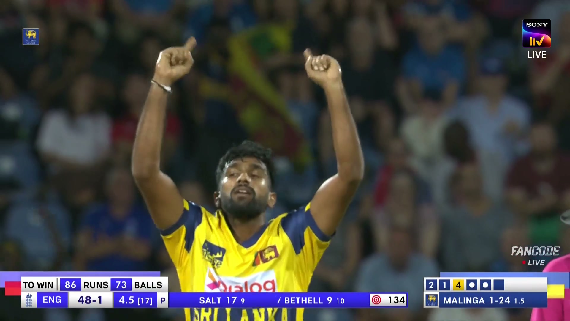 Wicket! Jacob Bethell Early Into The Drive As The Slower Off-Cutter Brings Eshan Malinga His Second