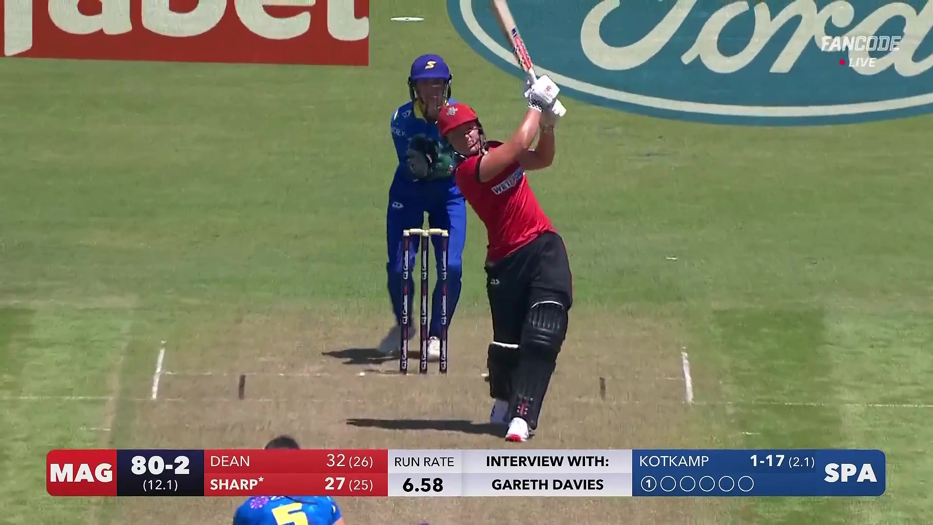 poster url for Six! Izzy Sharp Comes Down The Track And Tonks It Over Mid On For A Maximum